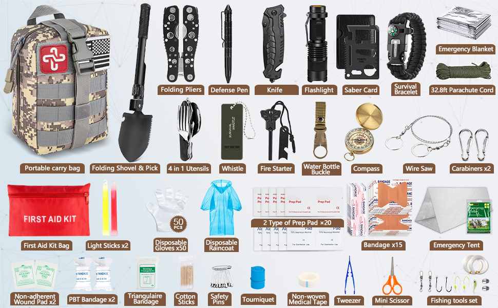 O kit de sobrevivência de emergência e kit de primeiros socorros 238 unidades foi projetado para caminhantes, campistas, equipes de resgate e qualquer pessoa que se prepare para emergências inesperadas ao ar livre. Usando materiais duráveis e resistentes às intempéries e de nível profissional componentes, esteO kit fornece ferramentas essenciais para sobrevivência, navegação, primeiros socorros e sinalização de emergência.