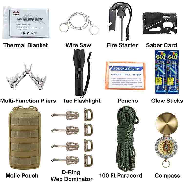 O Kit de Sobrevivência de Emergência Tático Militar 72H contém suprimentos médicos de primeiros socorros e ferramentas práticas para viagens ao ar livre, acampamentos e outros cenários, atendendo às necessidades de diversão médica e ao ar livre. A bolsa de sobrevivência de emergência possui uma fivela que pode ser pendurada no cinto ou na mochila, facilitando o transporte. Compartimentos internos para fácil acesso.