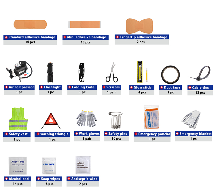 Ele contém band-aids, desinfecções de algodão, ataduras, tesouras, pinças etc. Esses itens podem lidar com pequenos cortes e abrasões que podem ocorrer na estrada.