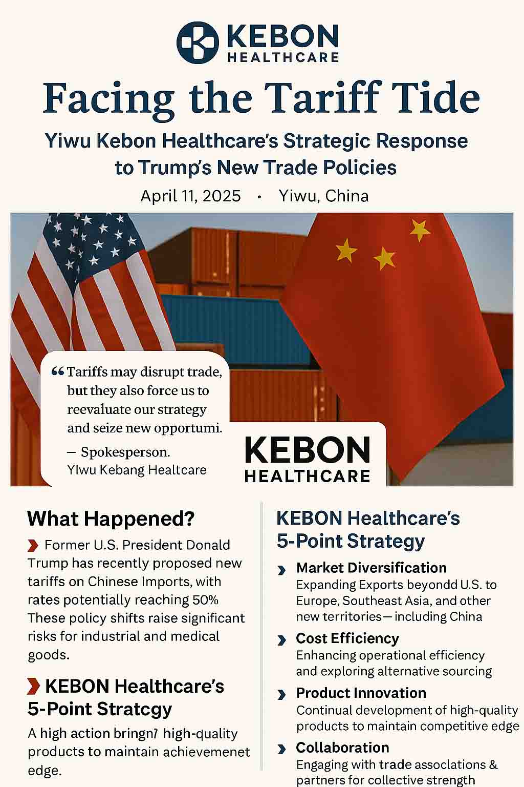 Kebang Medical Exibirs esse desafio como um catalisador de crescimento e elevação da marca. Com a visão global, parcerias fortes e logística flexível, a empresa está bem preparada para prosperar em um ambiente comercial em mudança.