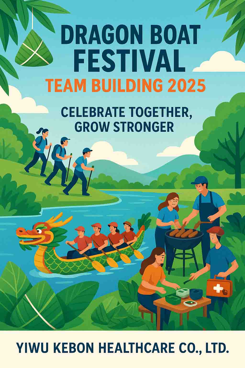 Para comemorar o próximo festival tradicional chinês-o Dragon Boat Festival-Yiwu Kebon Healthcare Co., Ltd. organizará uma atividade de construção de equipes ao ar livre em toda a empresa no início de junho. O evento, temático "Festival Saudável de Barcos de Dragão, avançando juntos", pretende fortalecer a coesão da equipe e aprimorar a colaboração entre todos os funcionários.