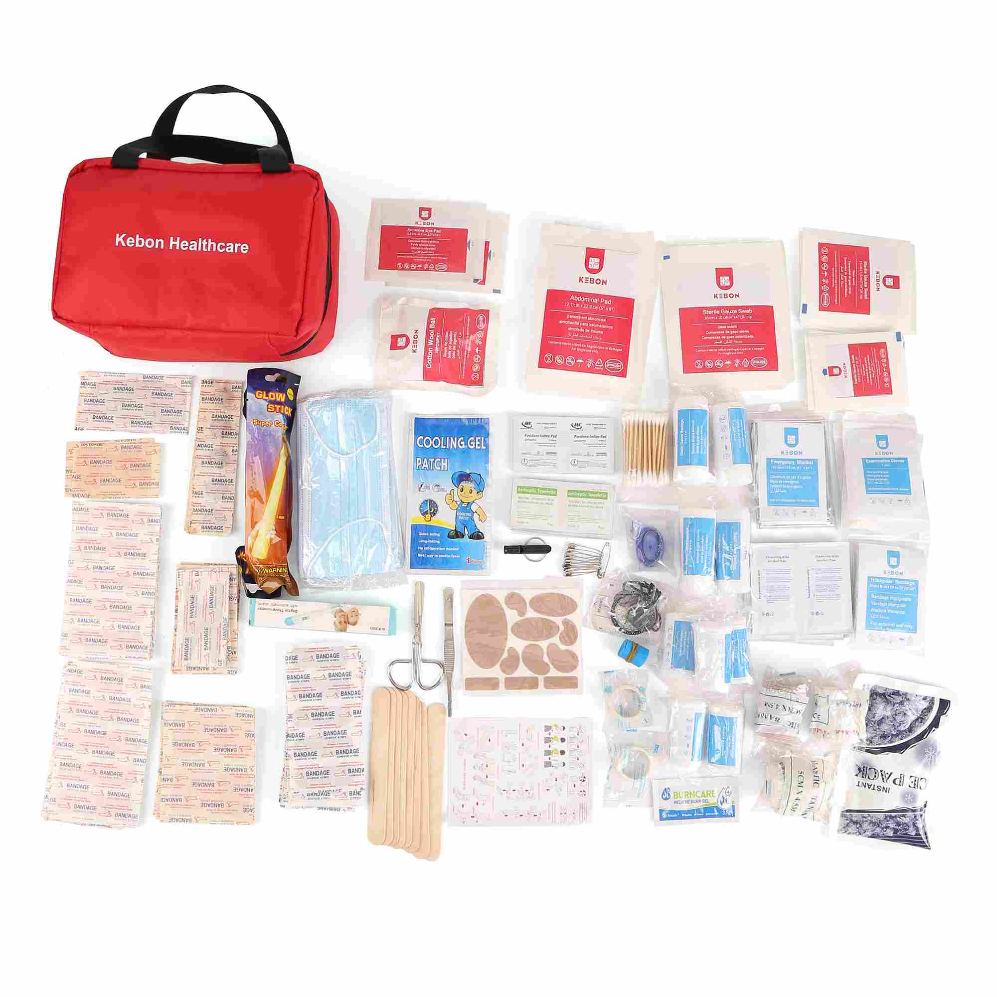 CategoriaItens incluídosCurativos estéreisAbsorventes de gaze, curativos estéreis, absorventesBandagens e bandagensBandagens elásticas, ataduras triangulares, fita adesivaCuidados de feridasAtaduras adesivas mistas, compressas embebidas em álcool, lenços de limpezaFerramentas de emergênciaTesouras, pinças, alfinetes de segurança, luvas descartáveisOutros itens essenciaisBolsa de gelo instantâneo, esparadrapo, folhas de gesso para feridas
