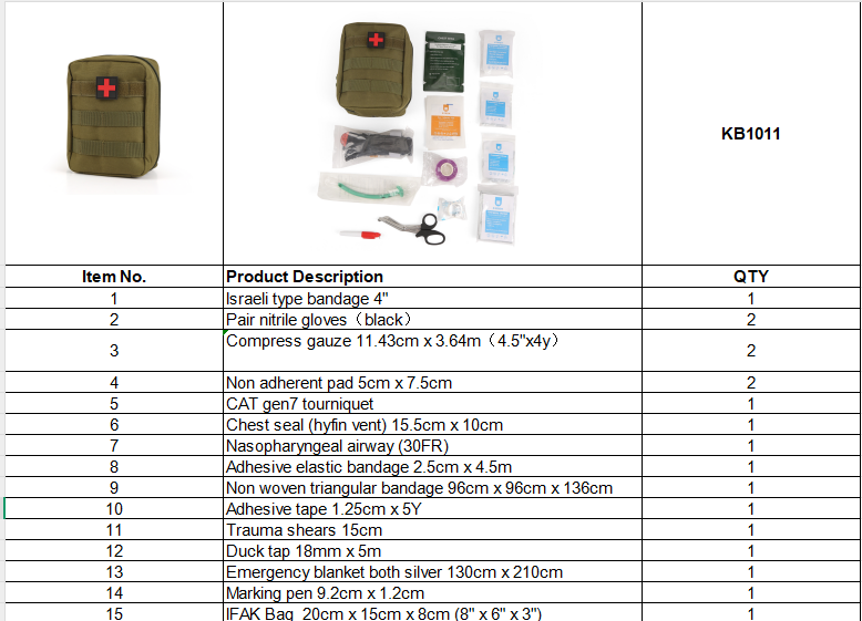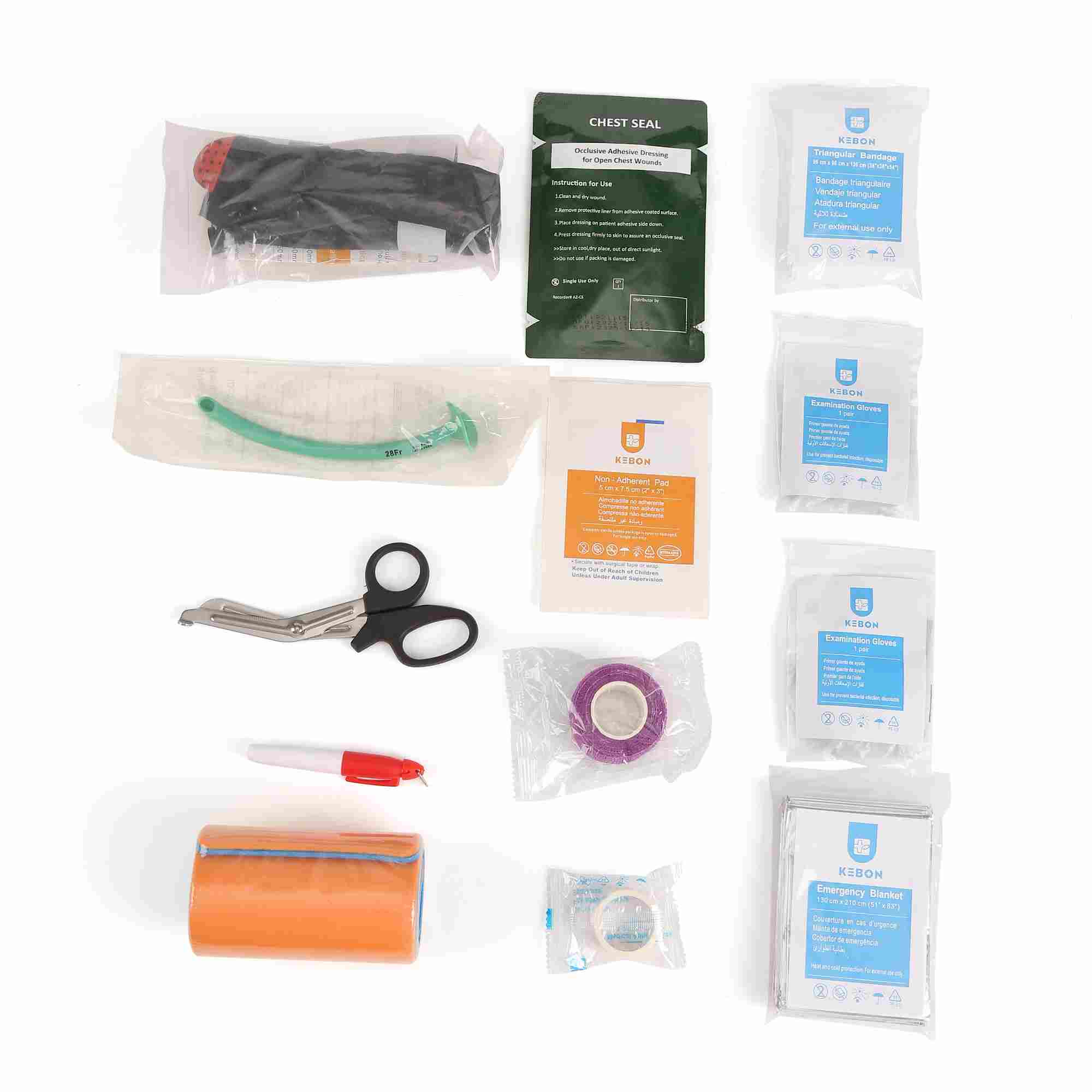 Yiwu Kebon Healthcare Co., Ltd fornece personalização OEM/ODM para organizações militares, policiais e de resgate. A cor, o logotipo e o conteúdo interno da bolsa podem ser totalmente personalizados de acordo com as especificações do cliente ou padrões de defesa nacional.